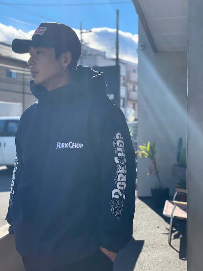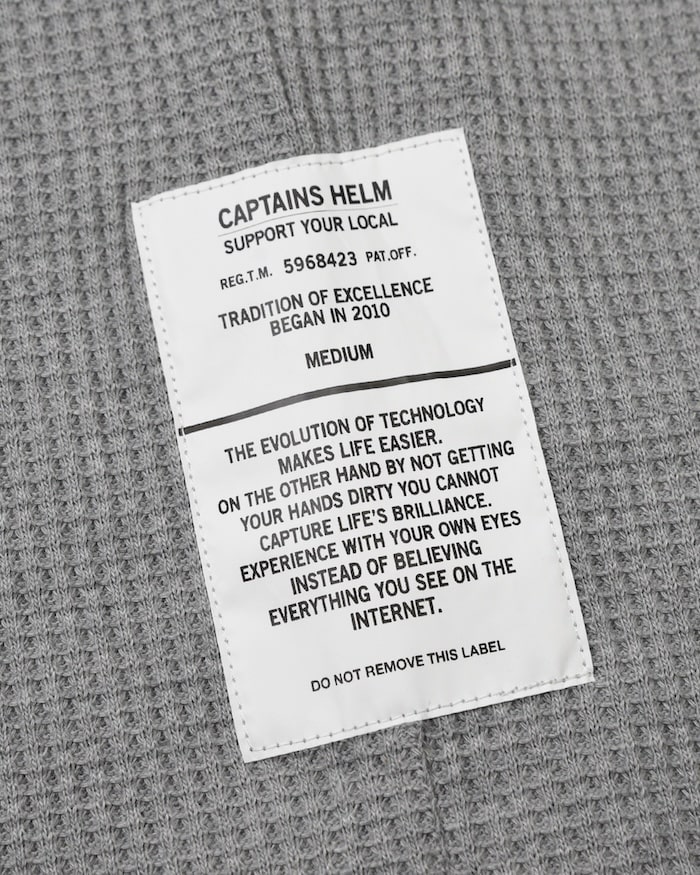 ロゴとモチーフをワッペンとプリントで配置。左裾にブランドタグ、脇接ぎにピスネームを付属。