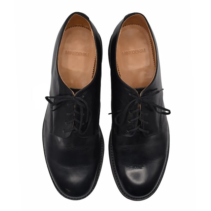 セレモニーなどでの正装の際に着用していたサービスシューズからインスピレーションを受け、MINEDENIMでは初となるレザーシューズをデザイン。