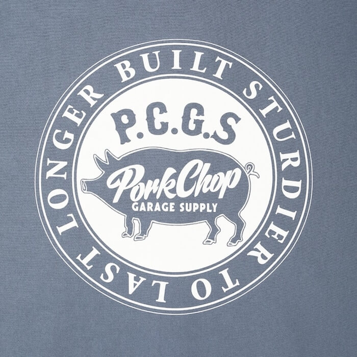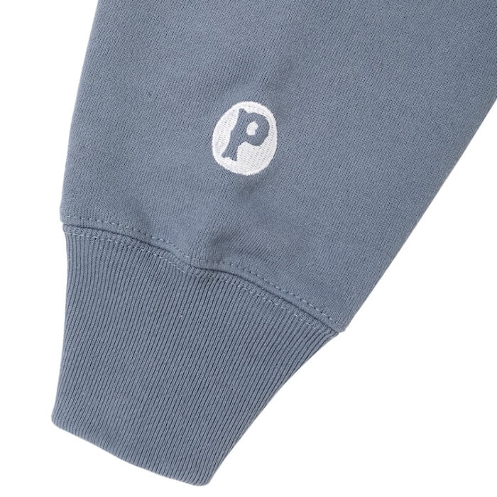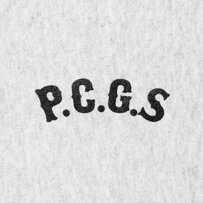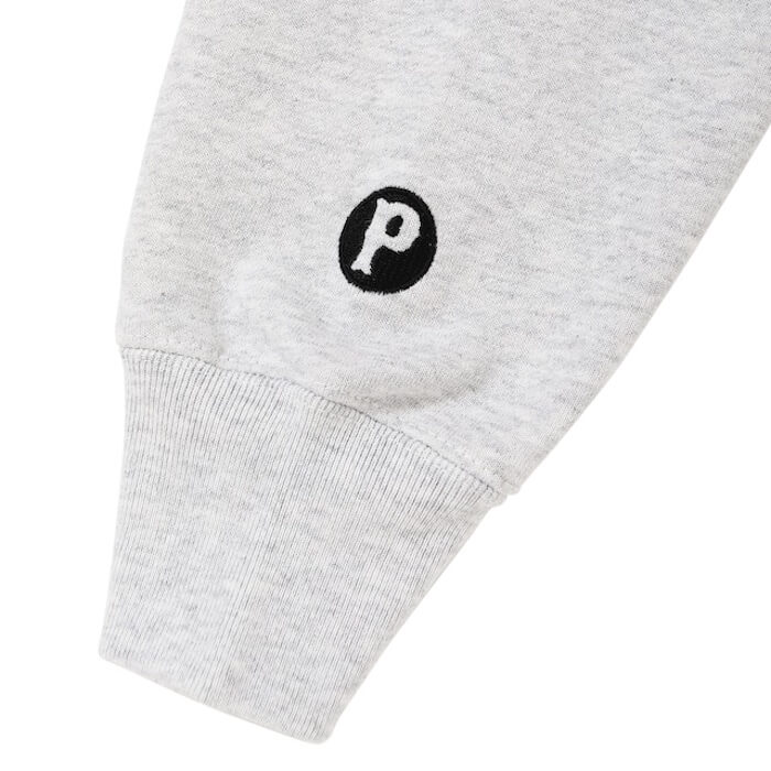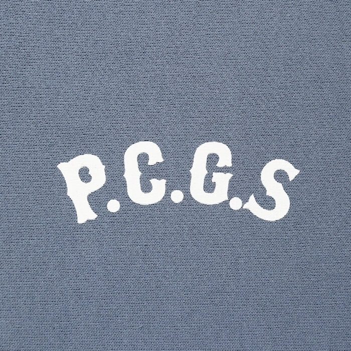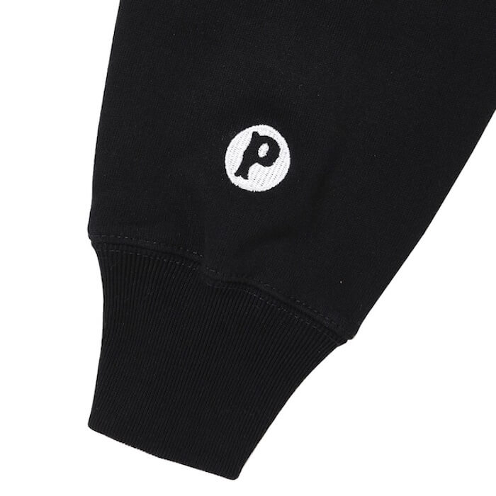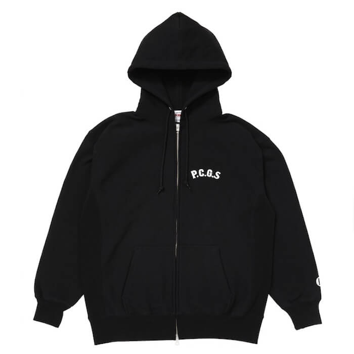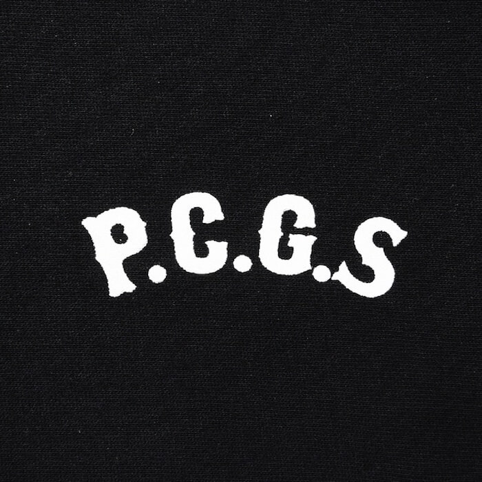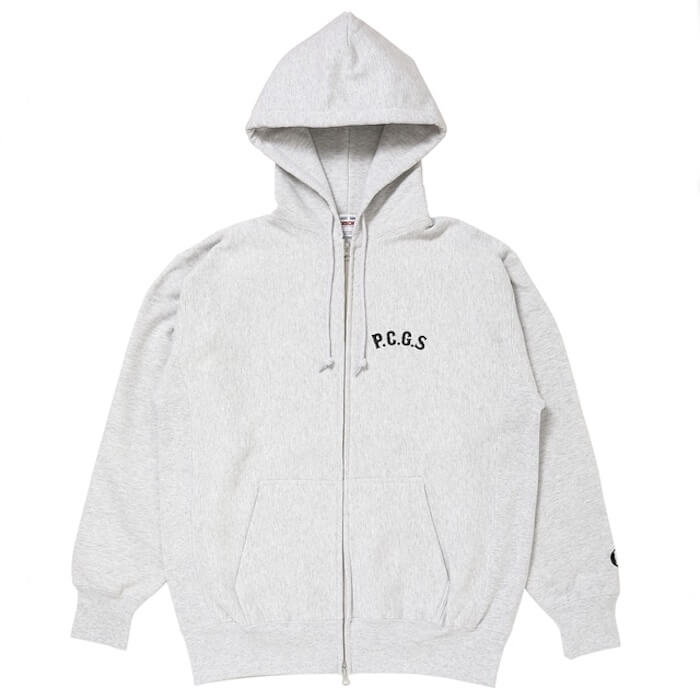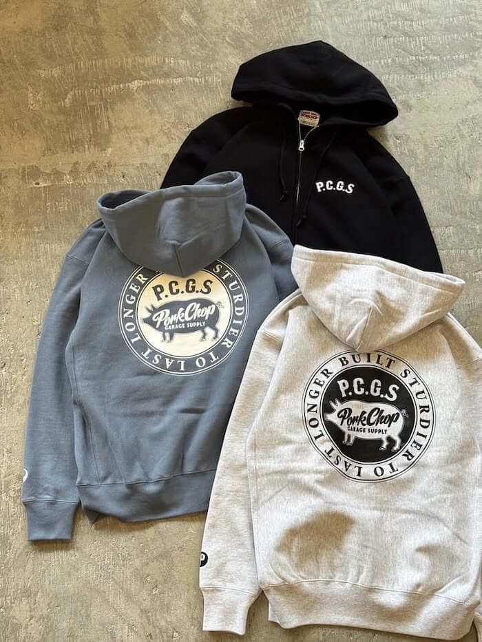 左胸にP.C.G.Sロゴ、左袖口にPロゴ刺繍、バックにサークル型のポークデザインのプリントを配したジップフーディになります。